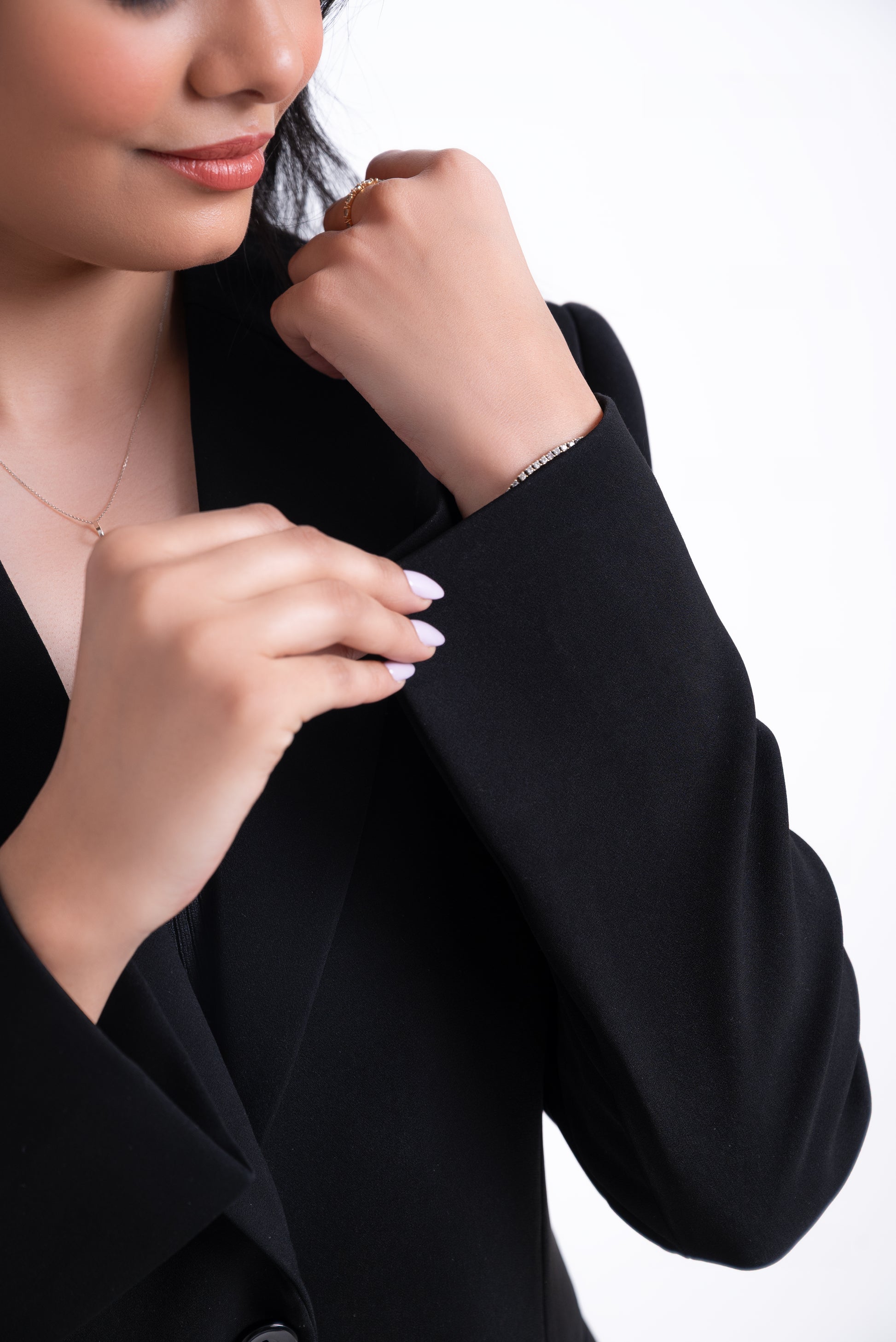 DESCRIPTION - A sharp, structured blazer designed to sculpt with confidence. With a sharp shoulder form and a close, streamlined fit, its premium Japanese fabric reinforces the power and poise of the modern woman in command.